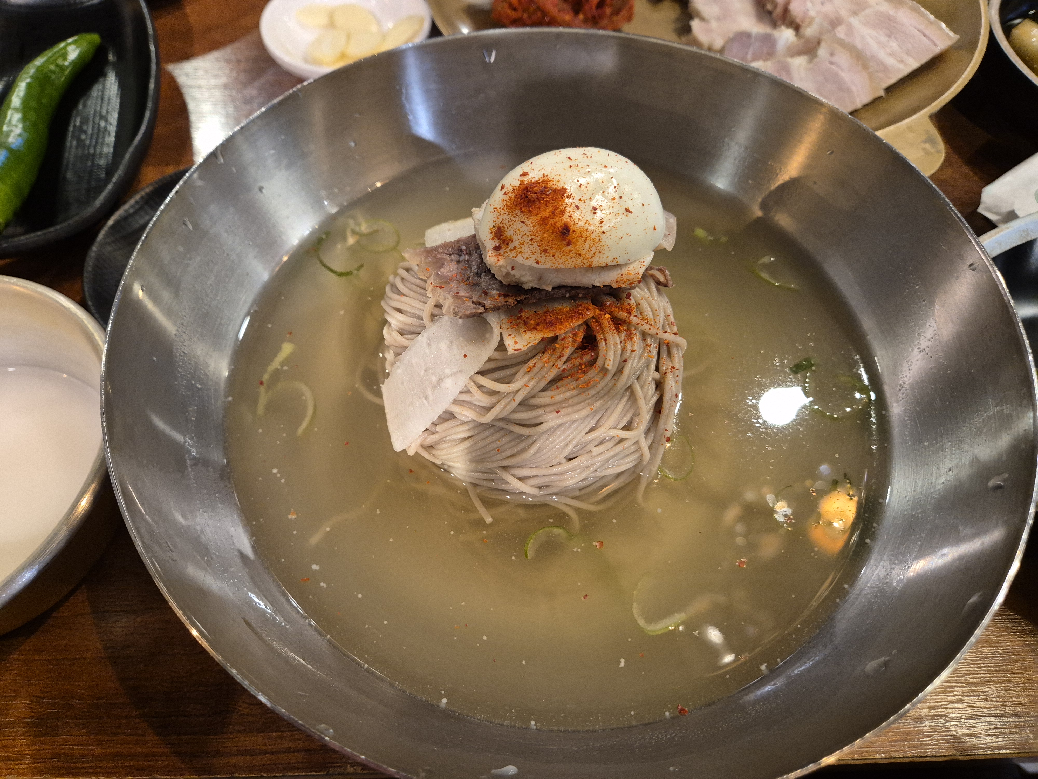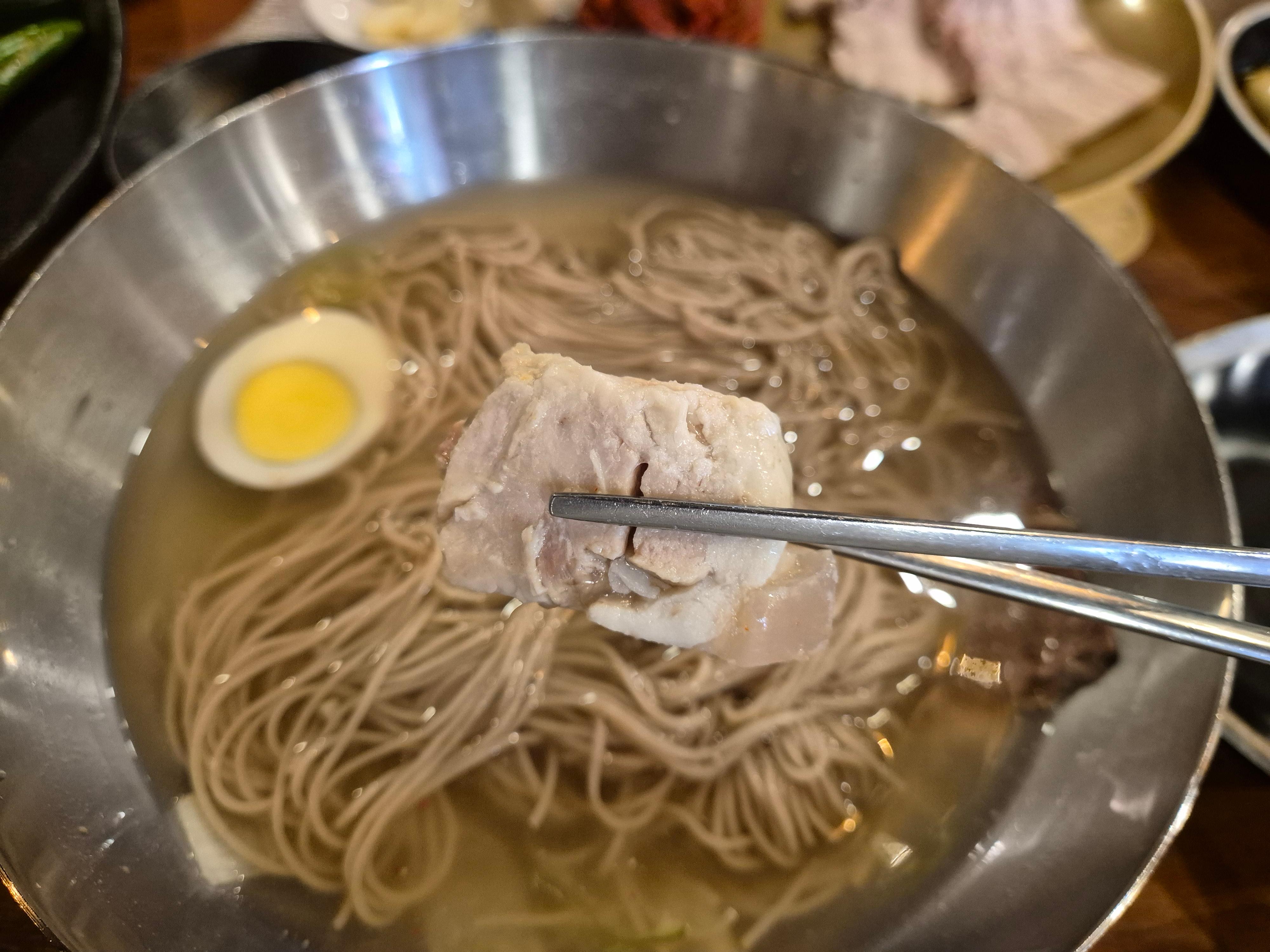 육수는 자극 없이 담백하고, 고명으로 올려진 배와 오이, 계란이 전체 밸런스를 잡아준다.
