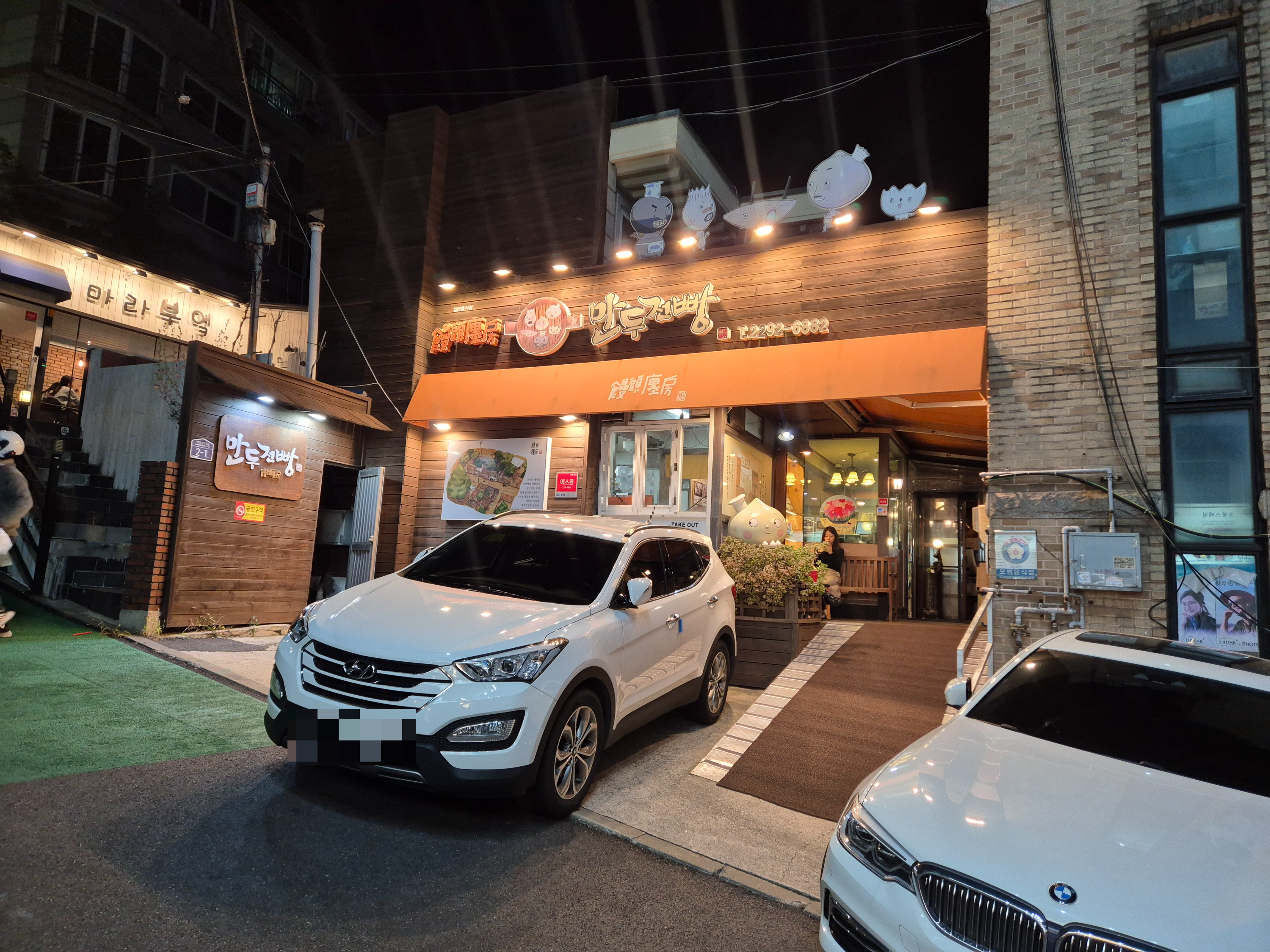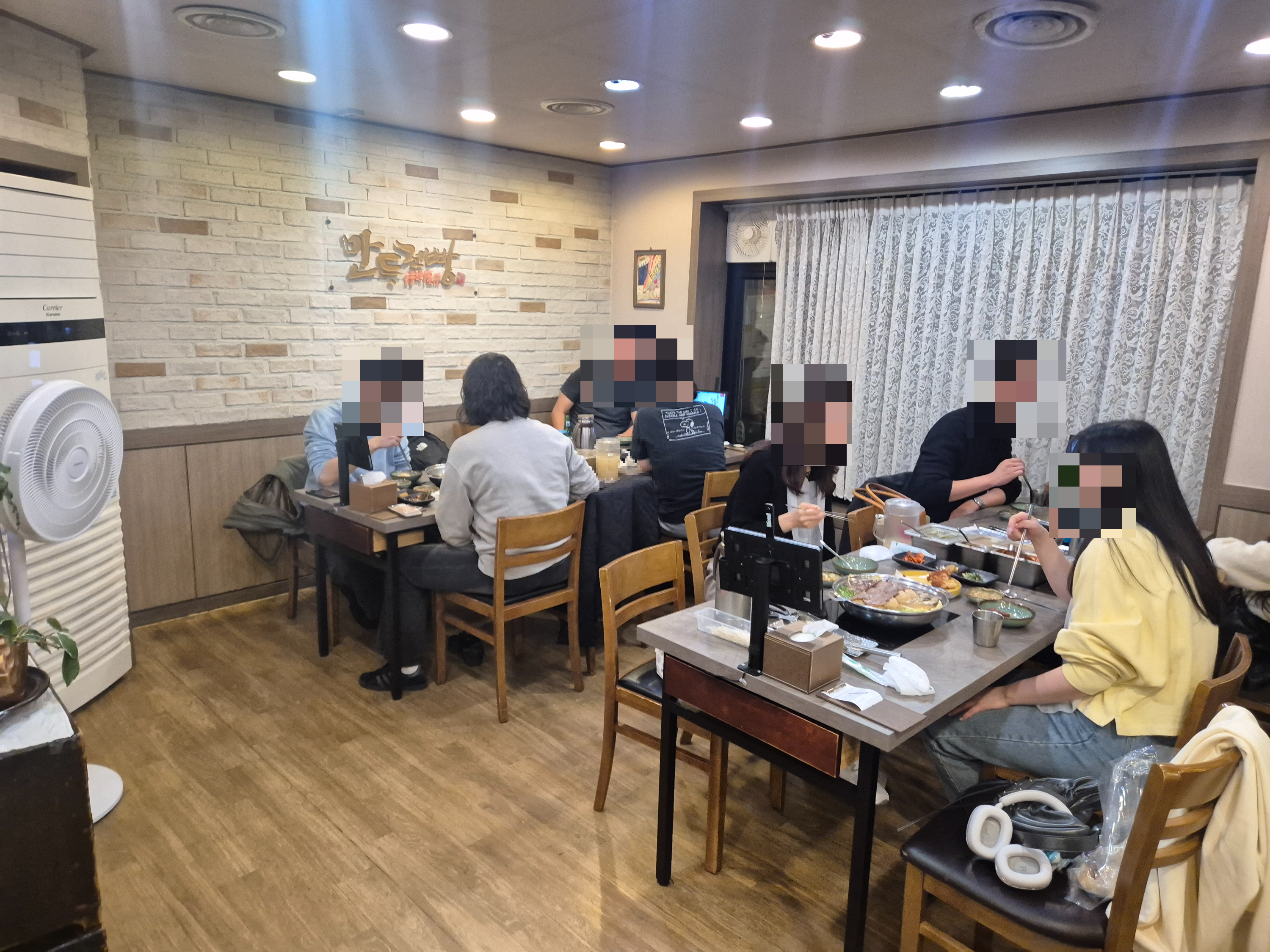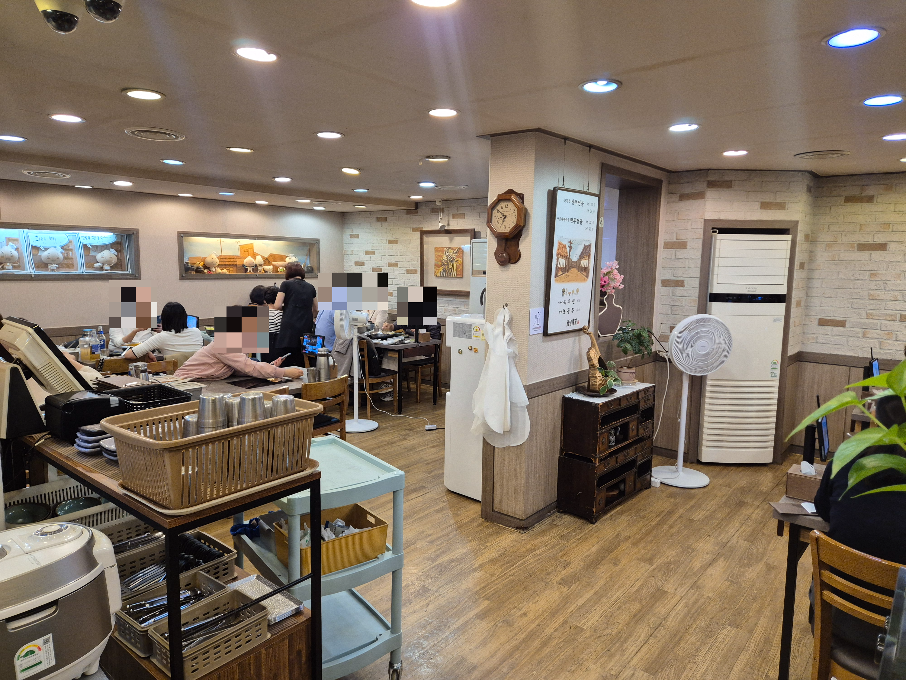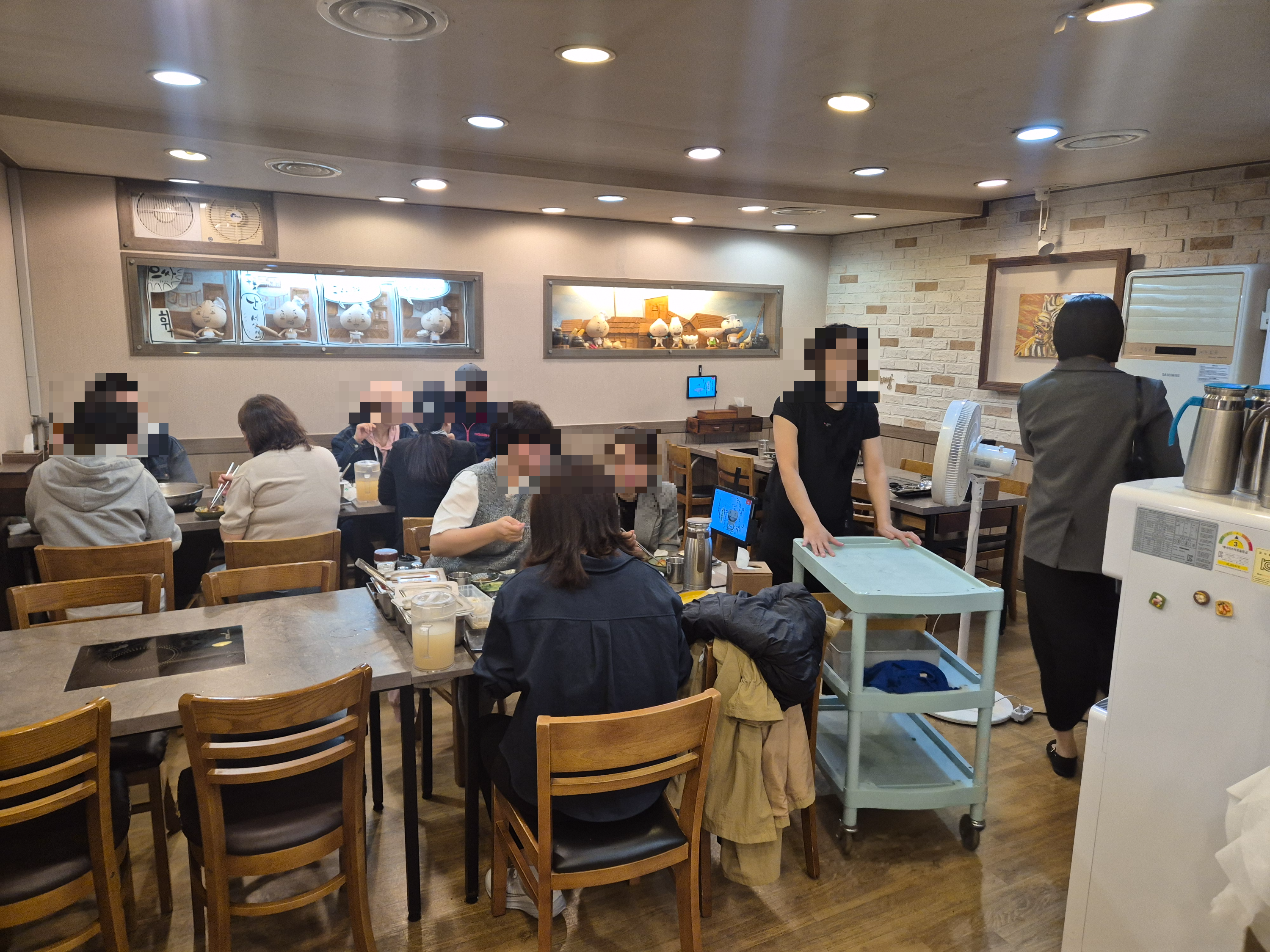 벽면에는 손님들이 남긴 짧은 후기 메모들과 방송 출연 사진이 가지런히 붙어 있고, 따뜻한 조명 아래에서 김이 피어오르는 만두전골 냄비들이 연신 끓고 있습니다.