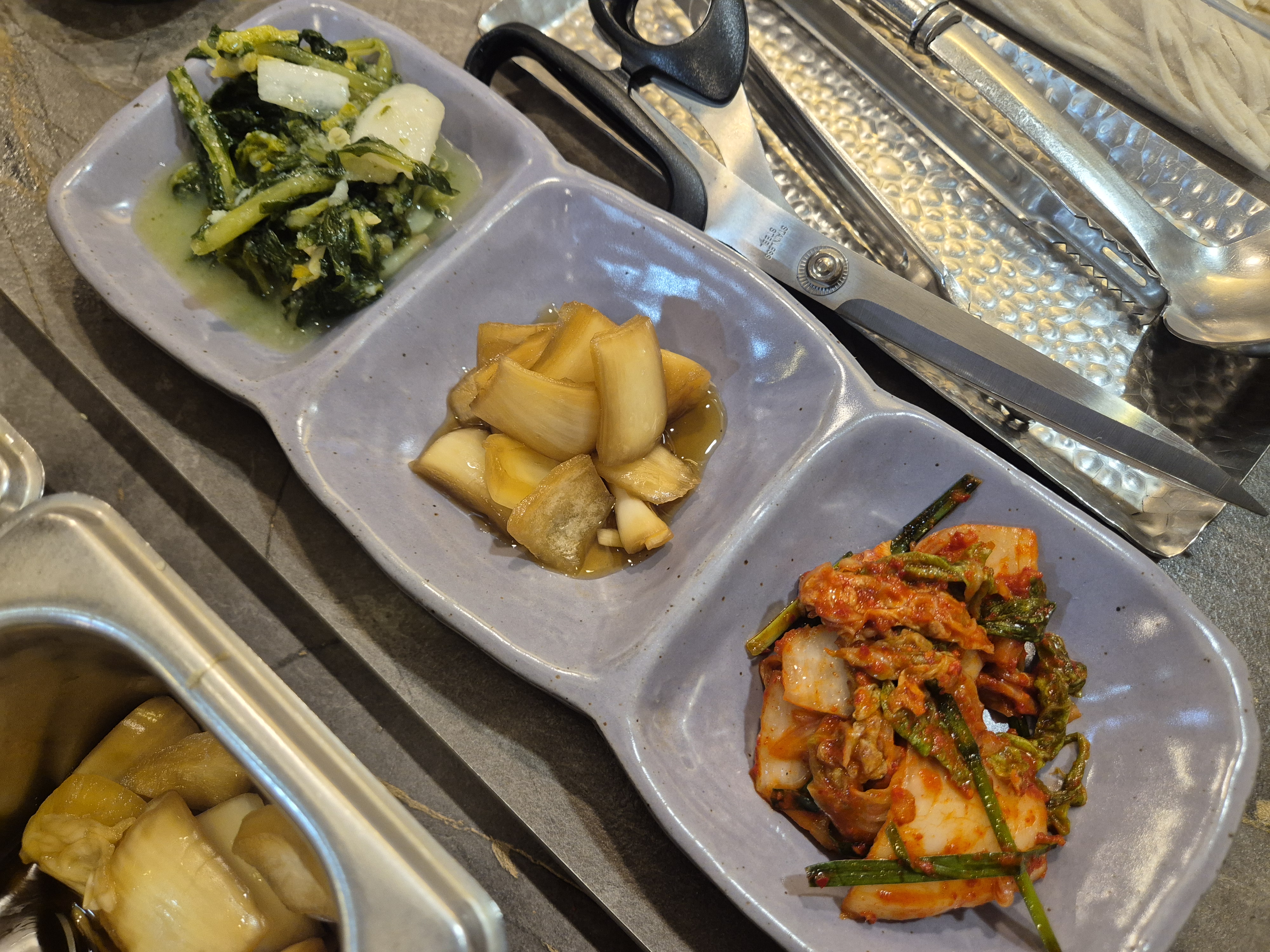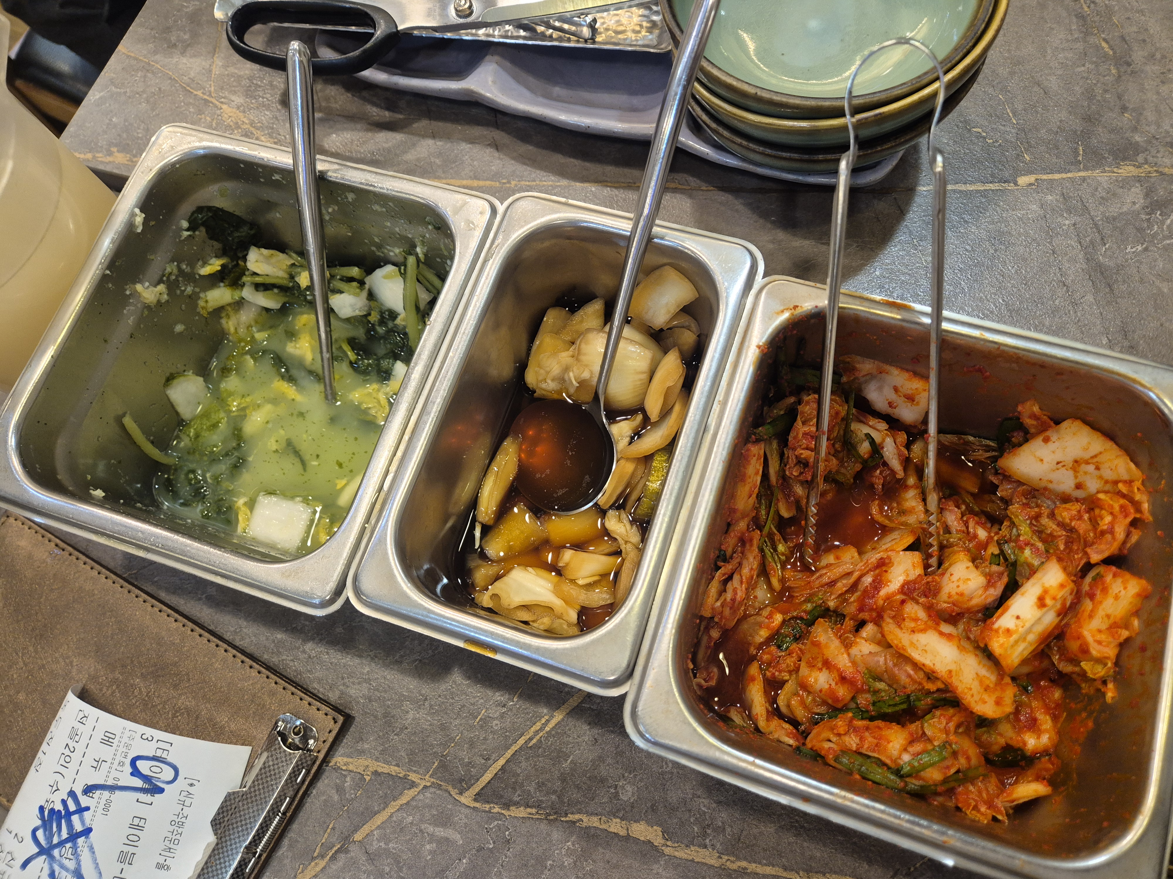 테이블 위에는 심플한 찬 구성—배추김치, 열무김치같은 백김치가 놓입니다.